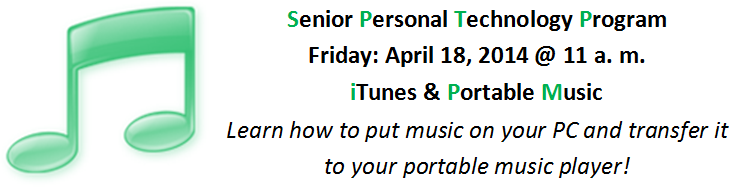 Hi everyone, just a reminder that our monthly Senior Personal Technology program is being held tomorrow, Friday, April 18; start time is 11 a. m.